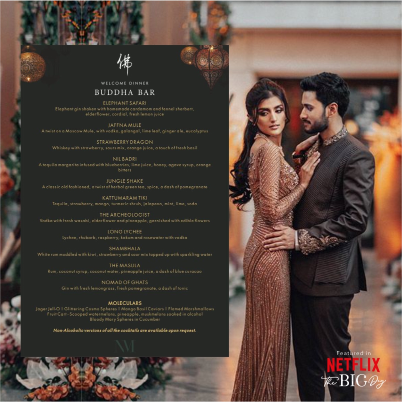 The Big Day episode featured Nikhita and Mukund enjoying and celebrating their wedding in the most luxurious way with Indian culture inspired welcome dinner, Alice in Wonderland theme Mehendi, Bollywood themed Cocktail part, a traditional day wedding followed by a Victorian Reception Dinner. The different events featured flame throwers, dreamy photobooths, Fabergé-style eggs, servers dressed in ballgowns and so on. The welcome dinner venue also boasted of the couple’s wedding logo showcased on a large projector with a large Buddha statue in front of it.