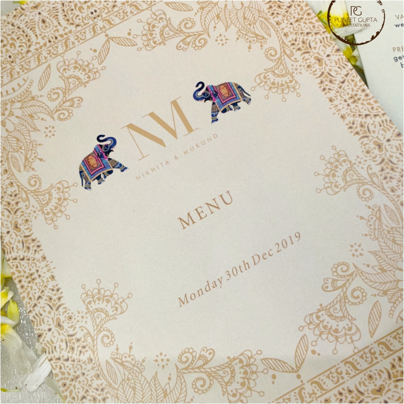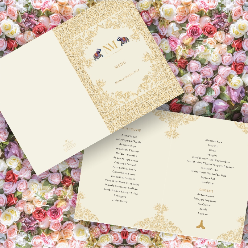 When Nikhita and Mukund first approached us for their wedding invitation suite, they had 1 thing in mind ‘Something Never Seen Before with a touch of extravagant personalisation’. It was a no brainer for us and we instantly decided to proceed ahead with the wedding invitation and wedding stationary design. From detailed logo designing to event theme based menu cards, each detail of the wedding was discussed to the very core.