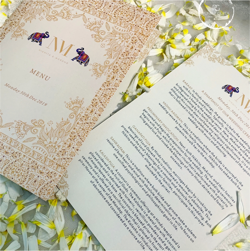 Here are some exclusive pictures of Nikhita and Mukund’s wedding menu, wedding itinerary, key card holder and many other wedding collaterals.