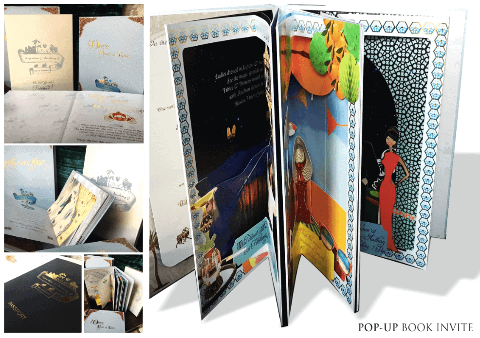 USP: The use of paper pop-up techniques to create 3D scenes of the events was not only astounding but also encompassed the USP of this whimsical fairytale invite. The Kinetic pop-ups added an element of movement and surprise to the overall invitation concept.