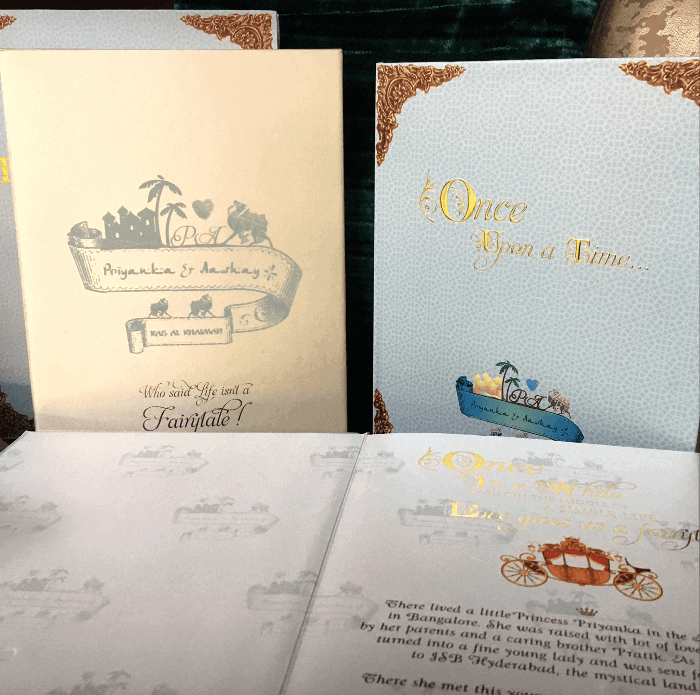 This ‘Once upon a lifetime’ invite starts with the narration of Princess Priyanka’s simple life that transformed into a fairytale when she met her Prince Aashay. The story further leads to a formal invite to the wedding celebrations in Ras Al Khaimah. A 3D passport and travel essentials along with a monochrome world map in the background and a ‘PA’ initial aeroplane kinetically moving to Ras Al Khaimah form a part of this formal invite. The fingerprint of the prince and the princess are also etched in the invite in the form of a beautiful red heart that is symbolic of the bond the couple share.