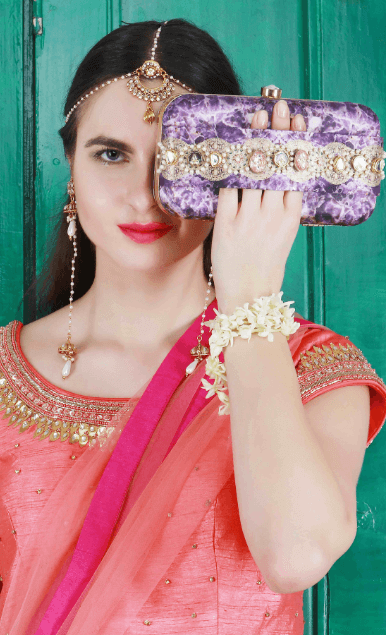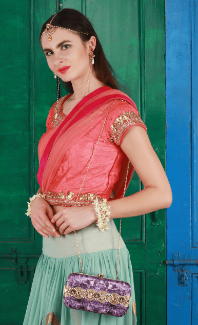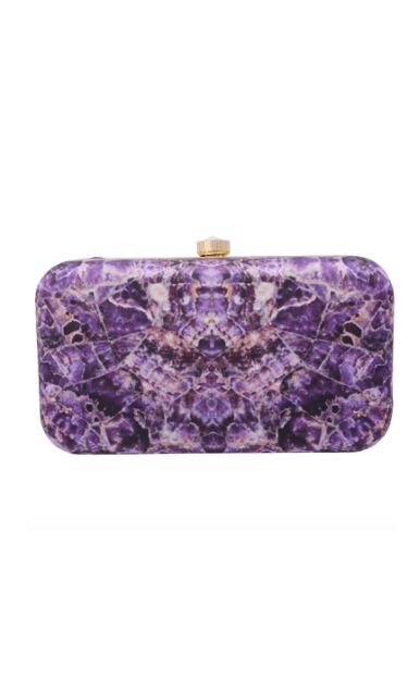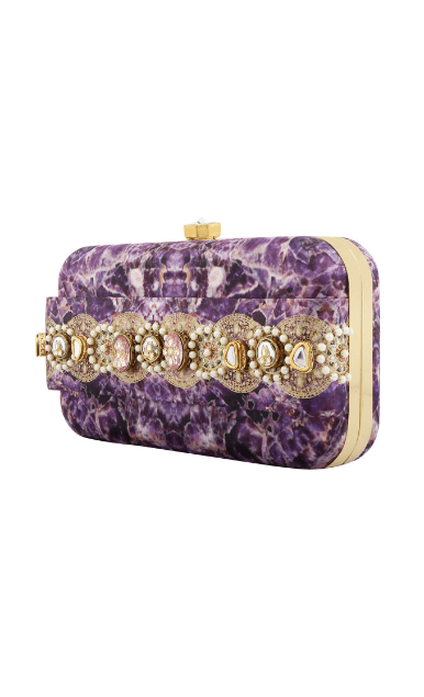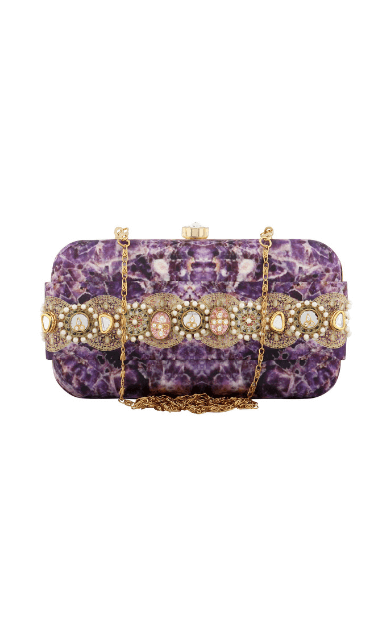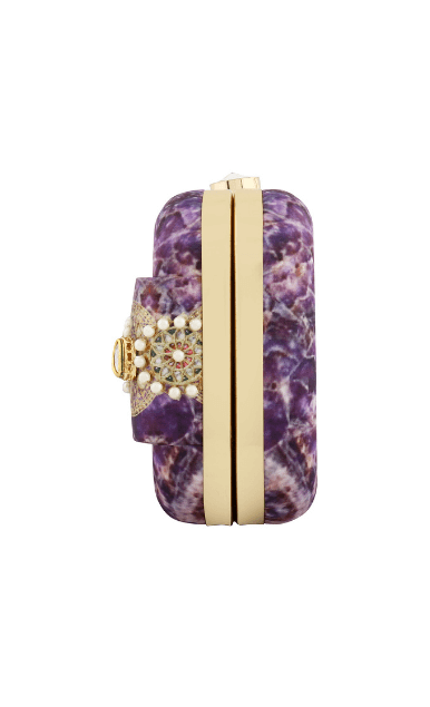 The Amethyst Clutch is from the REGAL CHRONICLES COLLECTION by designer Puneet Gupta. Perfect addition to your festive look, the clutch is inspired by the opulent life of Indian royalty and their magnificent jewels. Appliqué of pearls, vintage embellishments and semi-precious stones add to the style factor of this clutch.