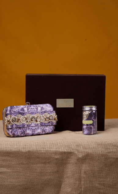 A perfect addition to your festive look, the clutch and pocket square gift box is inspired by the opulent life of Indian royalty. Applique of pearls, vintage embellishments and semi-precious stones add to the style factor of this clutch. Available in an elegant brown seude velvet gift box. Can be bought as bulk gifting option for festive celebrations for friends & family.
