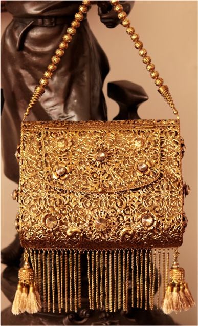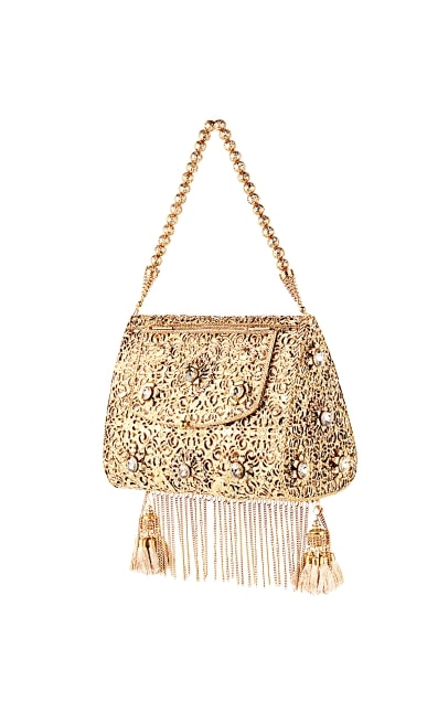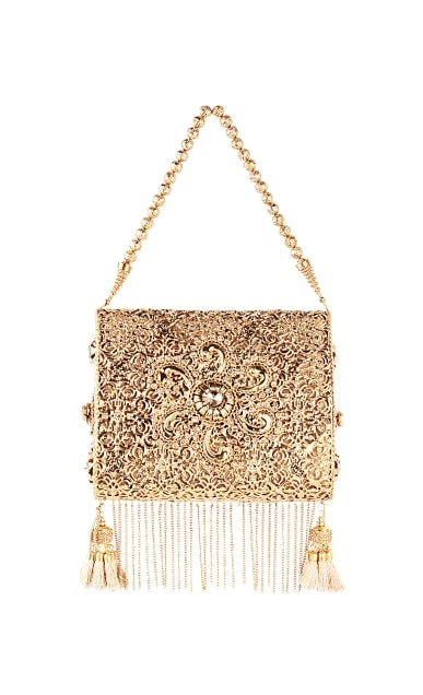 Inspired by the pure story of innocence of Goddess Astraea, the clutch depicts the raw beauty of gold metal. With wide spread laser cut tendril design, the clutch dates back to the justice that prevailed when Goddess Astraea lived with mankind during the Golden age. Hand-crafted with genuine stones and semi-precious metals, the beauty of Astraea lies within it’s unique, organic form. This box clutch taps into the ancient belief of wearing a trio of metals with natural stones to encourage spiritual harmony. With a art nouveau inspired look, the metal fringe tassels and handout metal ornaments provide the perfect finishing touch to any ensemble. These stylish clutches are from Puneet Gupta {Fine crafted goods} a designer label with its presence in Australia, UAE & USA.