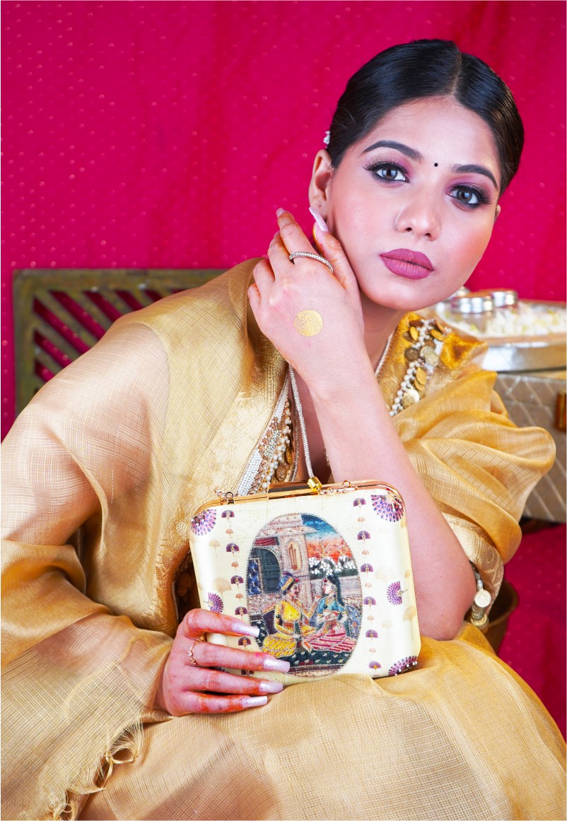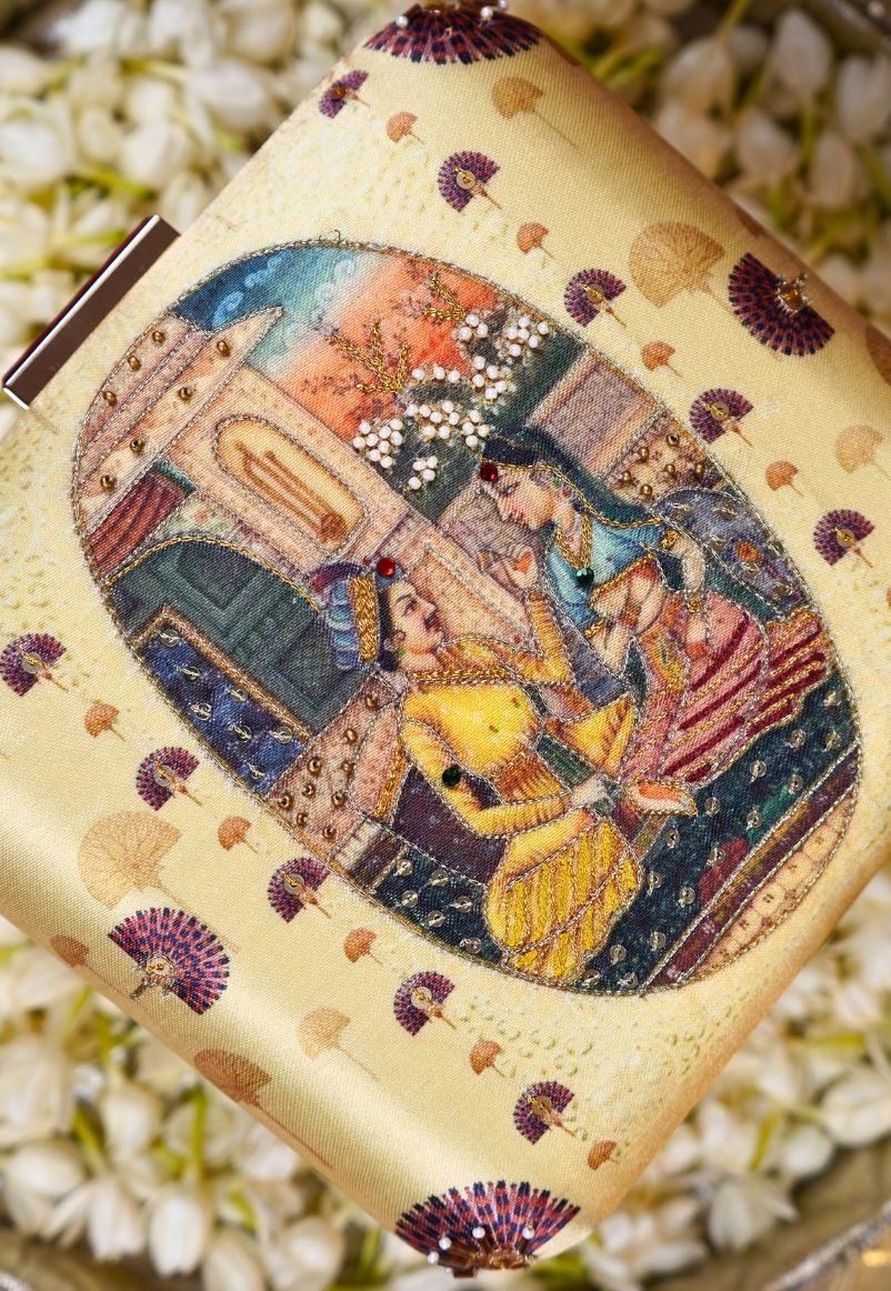 The clutch is adorned with Indian florals, symbolizing the bloom of their love, gracefully printed on either side of the royal couple. This portrayal is more than a design; it’s an ode to timeless romance, artistry, and the grandeur of an era bygone.
