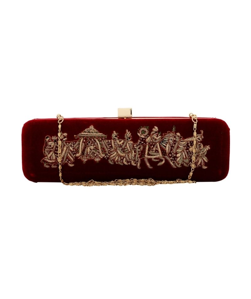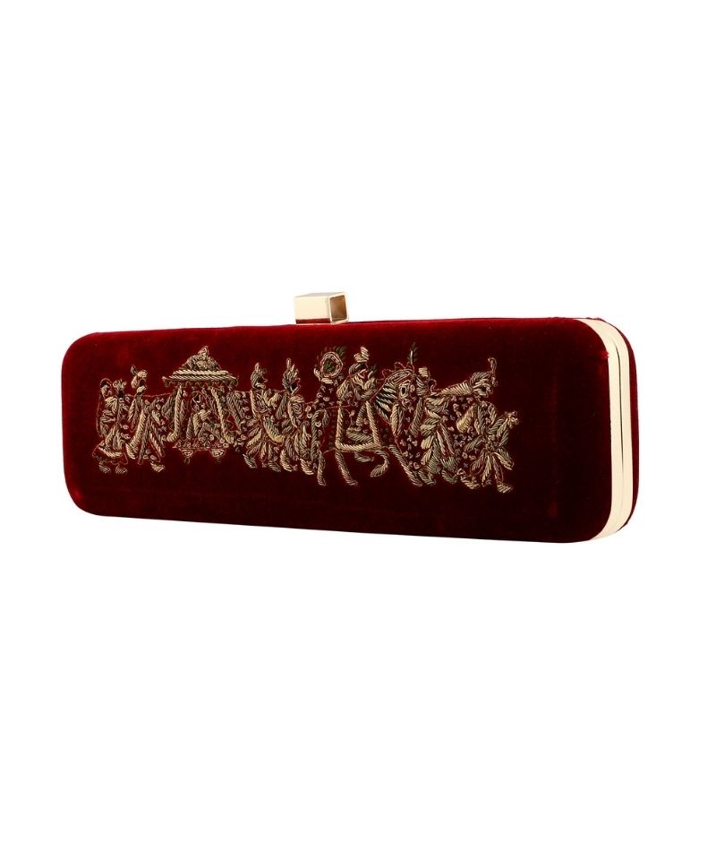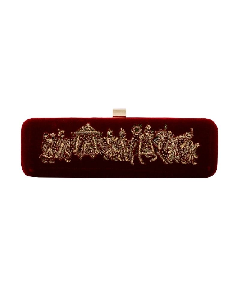 Cherish the beauty of hand embroidery and royal tales in one frame with this Mewar Mahal Clutch. The classic wedding Baraat scene is brought to life by intricately detailed antique gold work. These stylish clutches are from Puneet Gupta {Fine crafted goods} a designer label with its presence in Australia, UAE & USA.