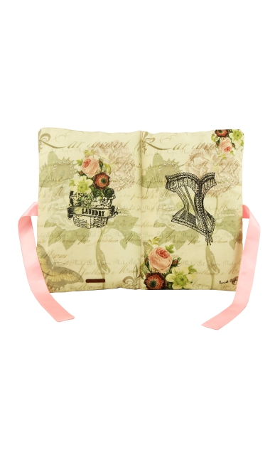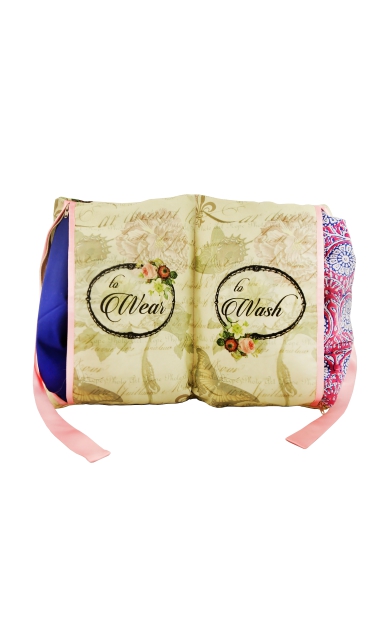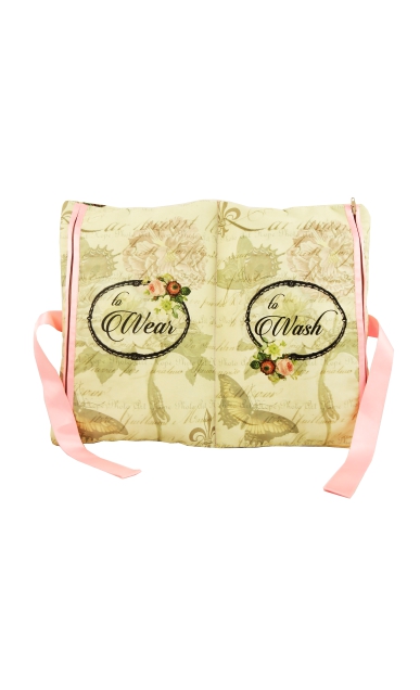 Our corset lingerie bag series is inspired from vintage laces and french lingerie designs. the colors are soft pastels with elegant graphic prints. Travel in style with our travel organizers, keep your used and fresh panties and bra separately in our water-proof wash & wear section in the bag. It’s makes your luggage organized, odor-free and clean. The Bag can be folder from the centre and tied with a satin ribbon to look like a pretty folder clutch.