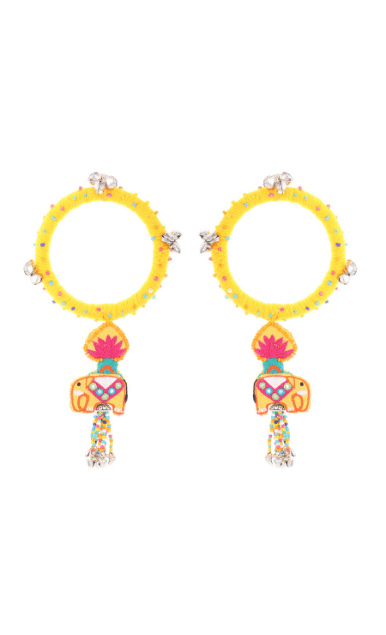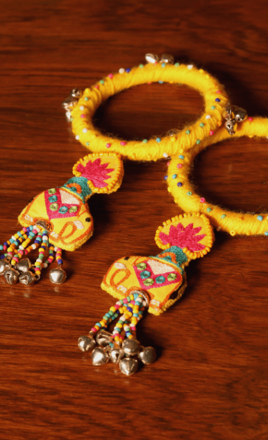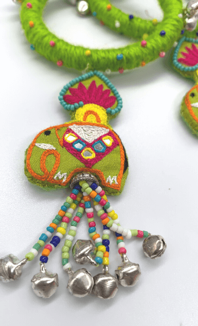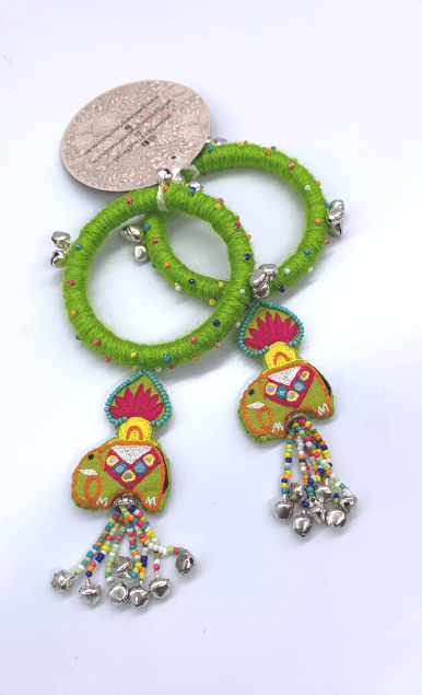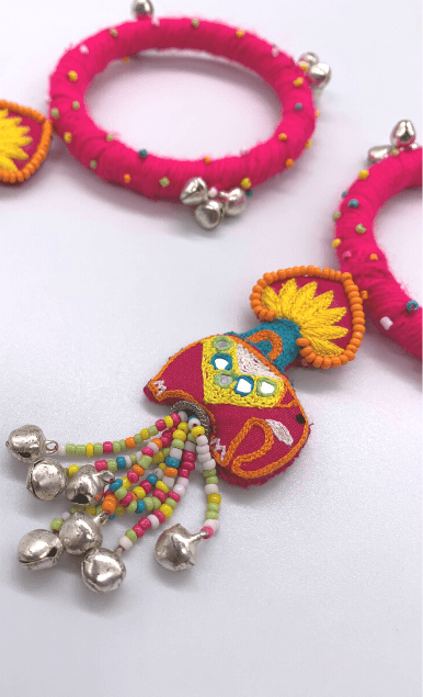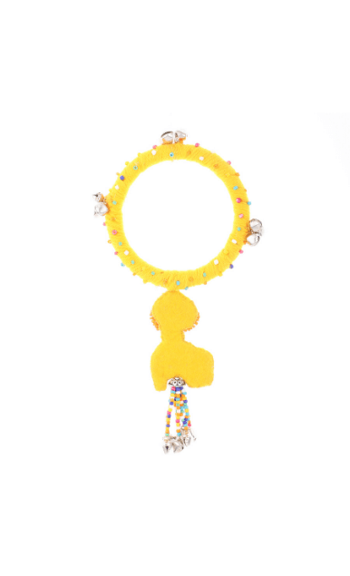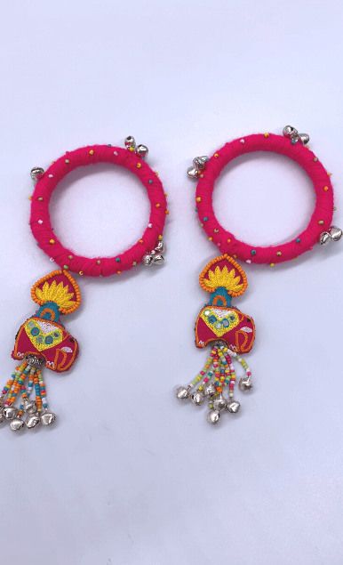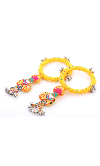 Cherish the beauty of flowers from Jinto’s farmland and this cute little baby elephant Toby in one frame with this Dangling Toby bangle. A beautiful lotus motif attached to the elephant designed theme at the bottom gives a prettier look. It’s luxuriously handcrafted with Resham embroidery, ghungroos and colourful beads. Get that perfect stylish contemporary look by adorning with this modern ethnic accessories and is sure to sparkle all day long.