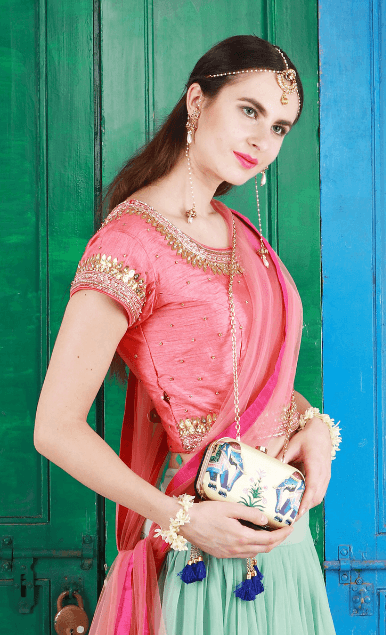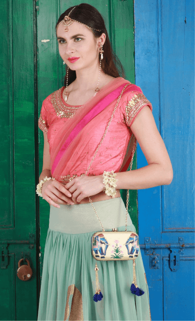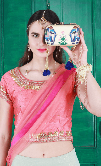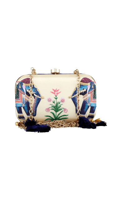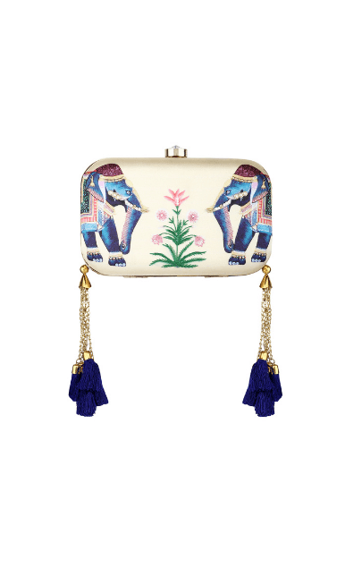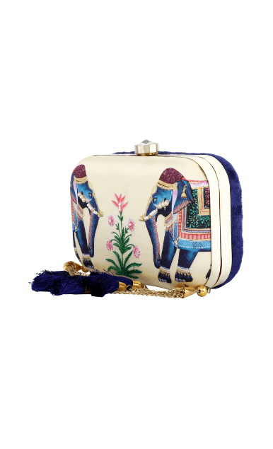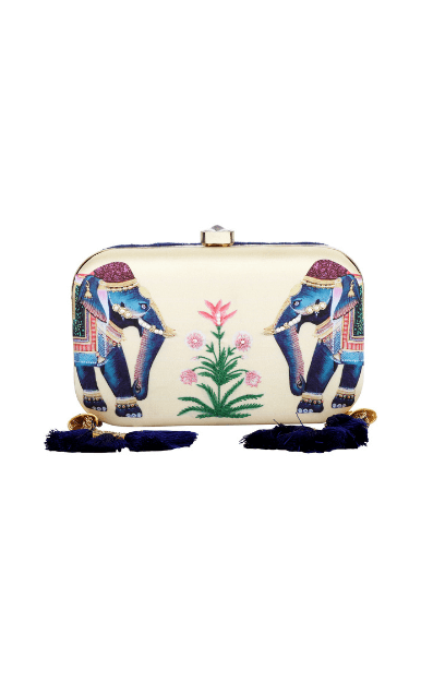 Drawing inspiration from a royal animal, the Eheravat clutch is a reflection of India’s rich heritage and lavish lifestyle. Adorned with navy blue tassels and a clasp lock, the clutch is a must have for your ethnic wardrobe. These stylish clutches are from Puneet Gupta {Fine crafted goods} a designer label with its presence in Australia, UAE & USA.
