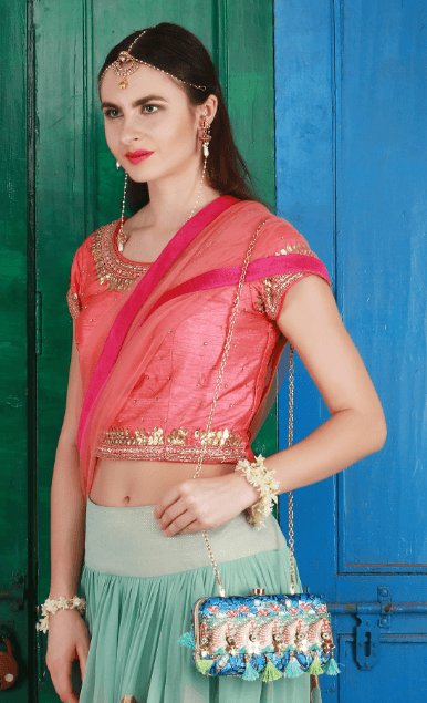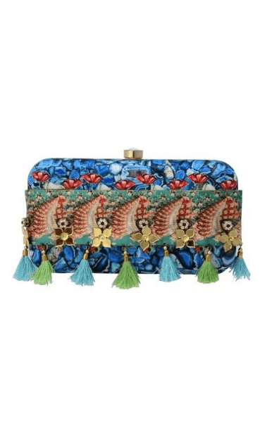 The Flora Sapphire Clutch is from the REGAL CHRONICLES COLLECTION by designer Puneet Gupta. Perfect addition to your festive look, the clutch is inspired by the opulent life of Indian royalty and their love magnificent jewels and exquisite flora.