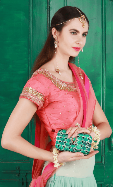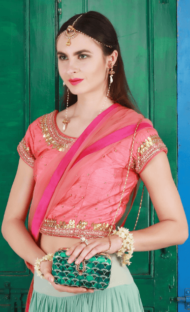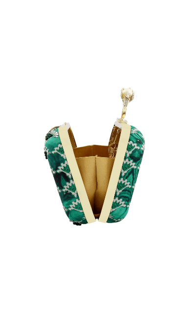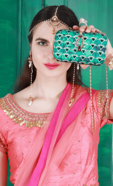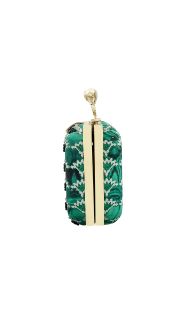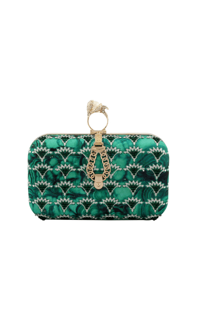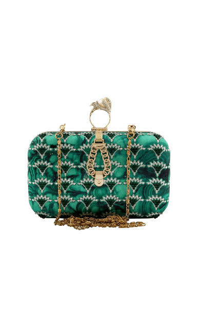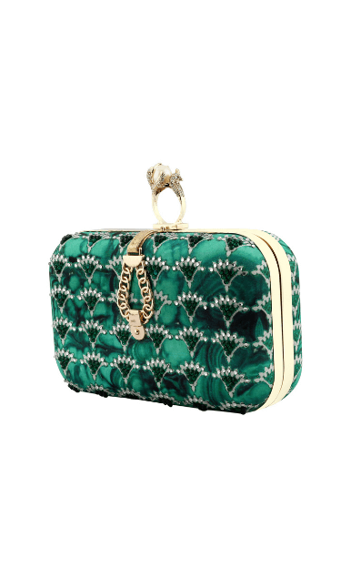 The Green Trinekt Clutch is from the REGAL CHRONICLES COLLECTION by designer Puneet Gupta. Perfect addition to your festive look, the clutch is inspired by the opulent life of Indian royalty and their magnificent jewels. Dual toned embellishments add a 3-Dimensional look to this clutch.