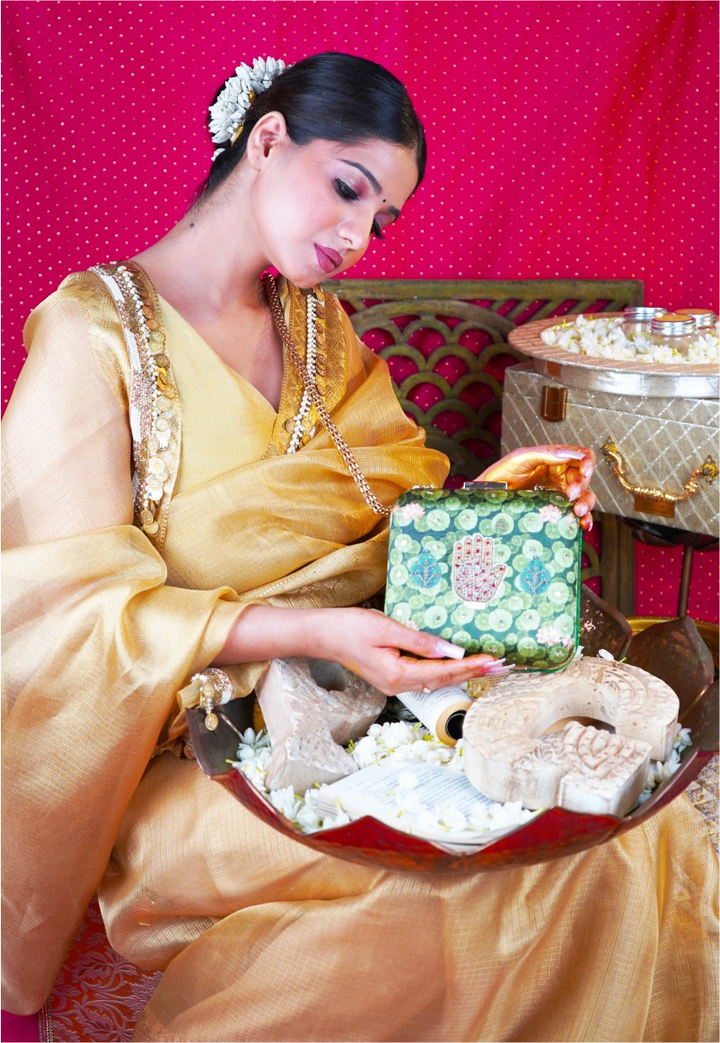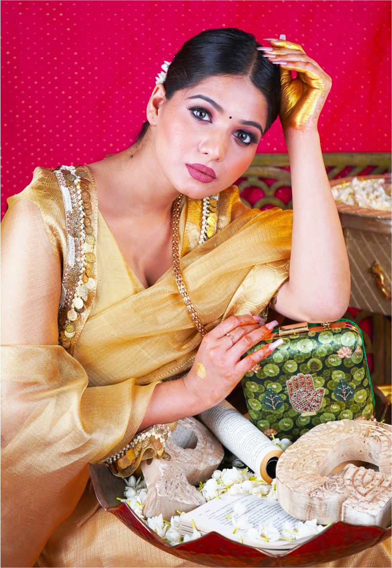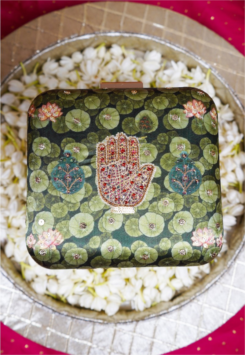 Step into a world of opulence with the “Hasthkala” Luxury Clutch, a masterpiece that embodies elegance, sensuality, and intricate artistry. This clutch showcases a royal hand motif, delicately placed within a lotus lake in the palace. Each lotus leaf is a canvas of opulence, some adorned with intricate zari embroidery, and others adorned with exquisite 3D embellishments, capturing the essence of a lotus lake in all its grandeur. It’s a portrayal of a royal hand in the lotus lake, a symbol of elegance, and it’s yours to cherish and adorn on those special occasions.