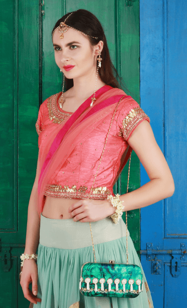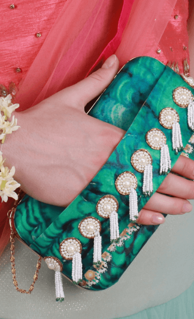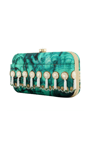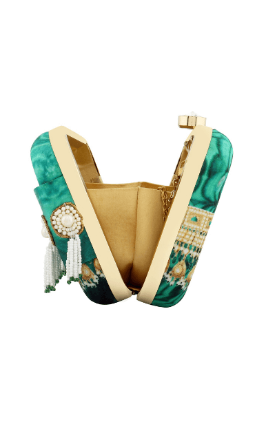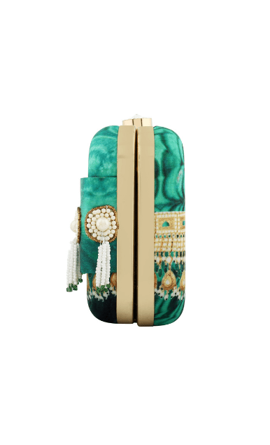 The Indian Jade Clutch is from the REGAL CHRONICLES COLLECTION by designer Puneet Gupta. Perfect addition to your festive look, the clutch is inspired by the opulent life of Indian royalty and their magnificent jewels. The antique metallic hand embroidery along with pearl tassels form the storyline for his clutch.