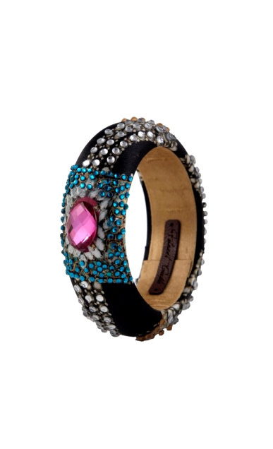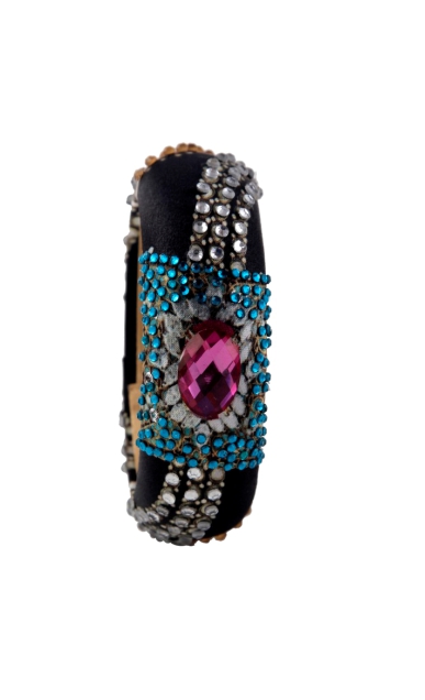 The  POLKI  CRYSTAL BANGLE is from the JAYPORE COLLECTION by designer Puneet Gupta. The bangle is our love for Royal vinatge Jewelry and iconography. The print is inspired by the rare princely jewelry of erstwile royal families of india. This jewel bangle will add a royal touch to your festive and occasional dressing.