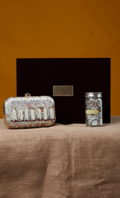 A must have for your ethnic wardrobeand bridal trousseau, the royal satin clutch is inspired by a classic jewel print along with pearl tassels. The gift box also includes a multi-printed pocket square to adorn your bandhgala. Available in a vintage brown seude gift box. Can be bought as bulk gifting option for festive celebrations for friends & family.