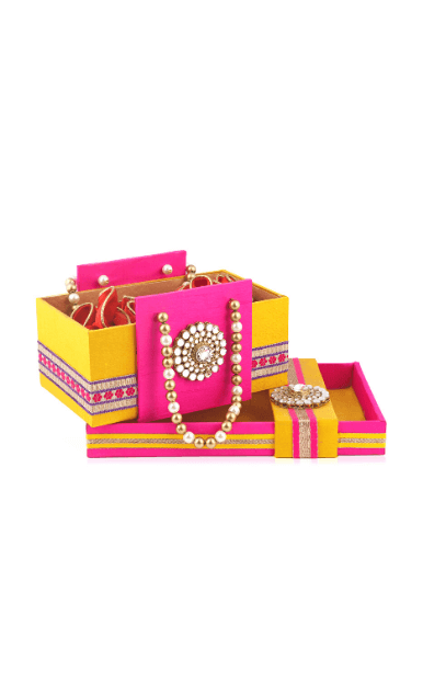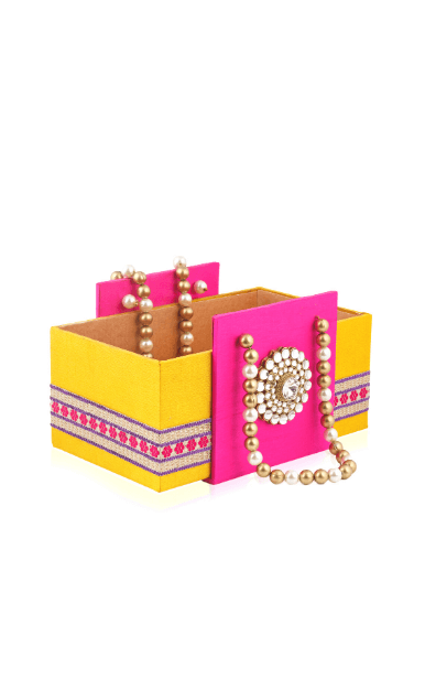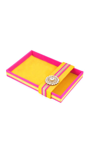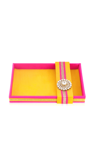 With quirky colour, the tray instantly adds a dose of elegance to your festive gifting. The golden lace and pearl brooch add ons further add to the style of the tray. Best used to pack trousseau or to present a gift to your dear ones.
