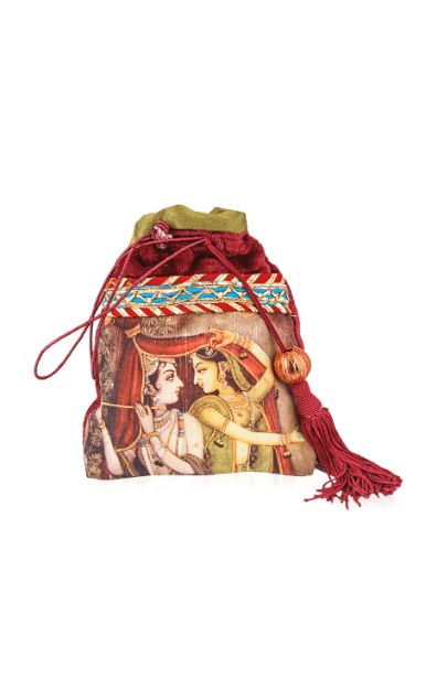 Showcasing the love story of Lord Krishna and Radha, this potli is must have for Lord Krishna’s devotees. With drawstring closure and ample space to carry your phone, makeup essentials and money, it is the perfect addition to your ethnic wardrobe.