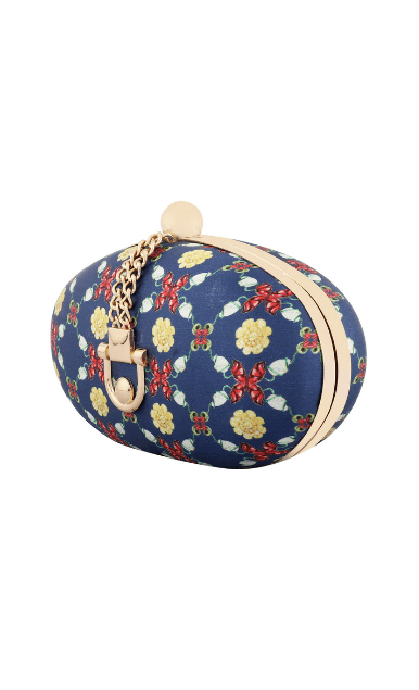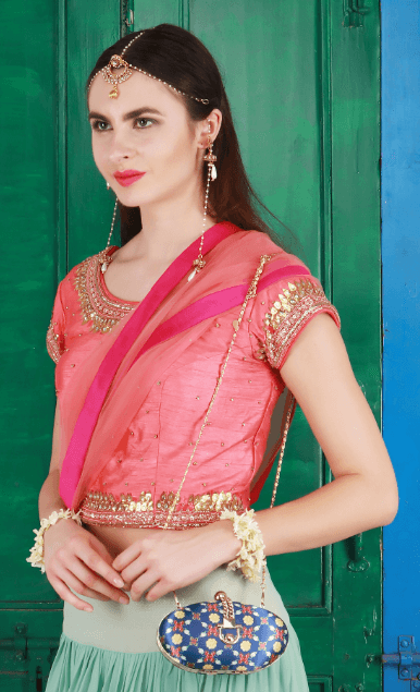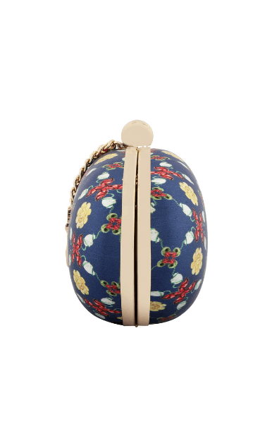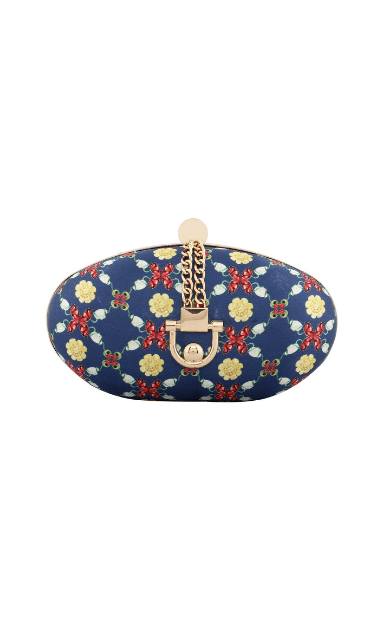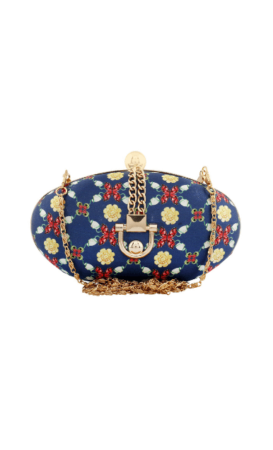 The Rangoon is from the REGAL CHRONICLES COLLECTION by designer Puneet Gupta. Perfect addition to your festive look, the clutch is inspired by the opulent life of Indian royalty and their love for exquisite flora. The amalgamation of round clasp lock with a chain adds a touch of vintage style to modern elements.