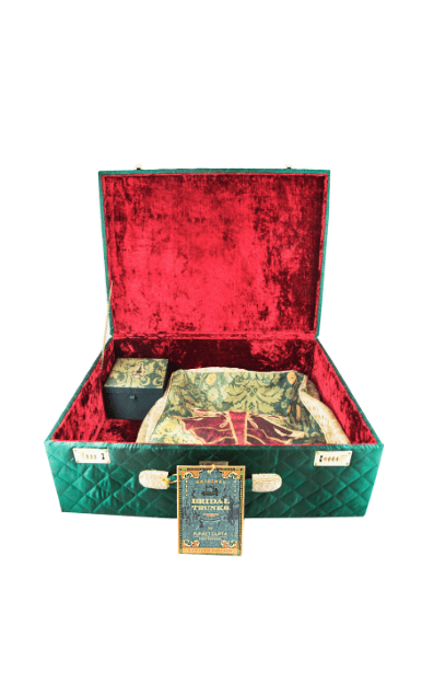 The Royal Angrakha comes with a lot of goodies inside it. It comes with a dress bag to keep your outfit, a footwear pouch and a jewel box to keep your jewelery safely. Puneet Gupta Bridal trunks are first of its kind in India, beautifully handcrafted to perfection, these eclectic trunks are the most fashionable and regale way of carrying your cherish memories, clothes, gifts and your personal belongings in your new home after your wedding. No need to pack your stuff in boring corrugated boxes or regular molded luggage available in the market.
