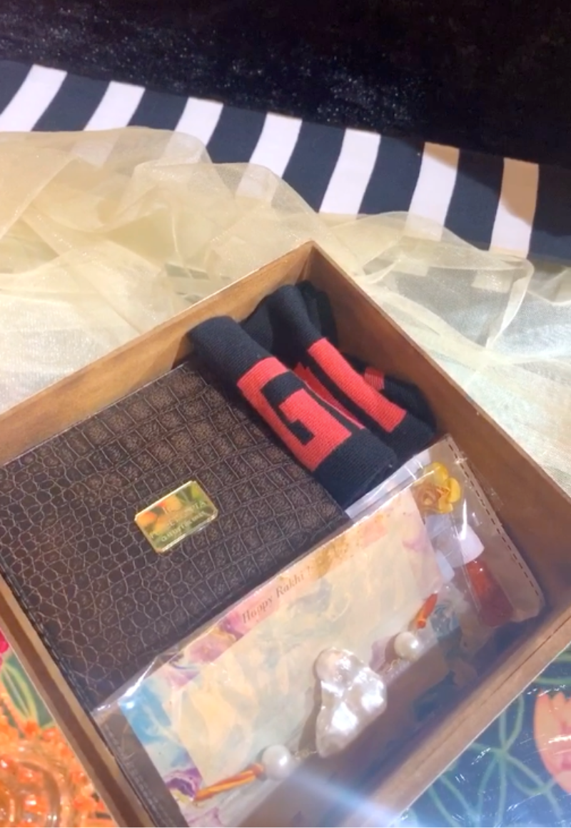 1 Reusable Box, 1 Cufflink Set, 1 Pair of Socks, 1 Rakhi and 1 Roli Chawal Packing