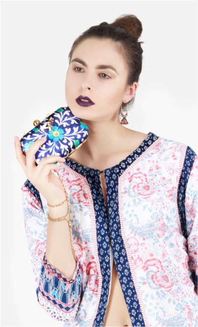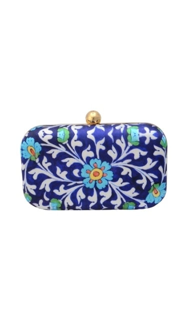 Accentuated with floral motif, the Theia clutch is enhanced with gold embellishment. Featuring a gold lock in front, the clutch is easy to carry.These stylish clutches are from Puneet Gupta {Fine crafted goods} a designer label with its presence in Australia, UAE & USA.