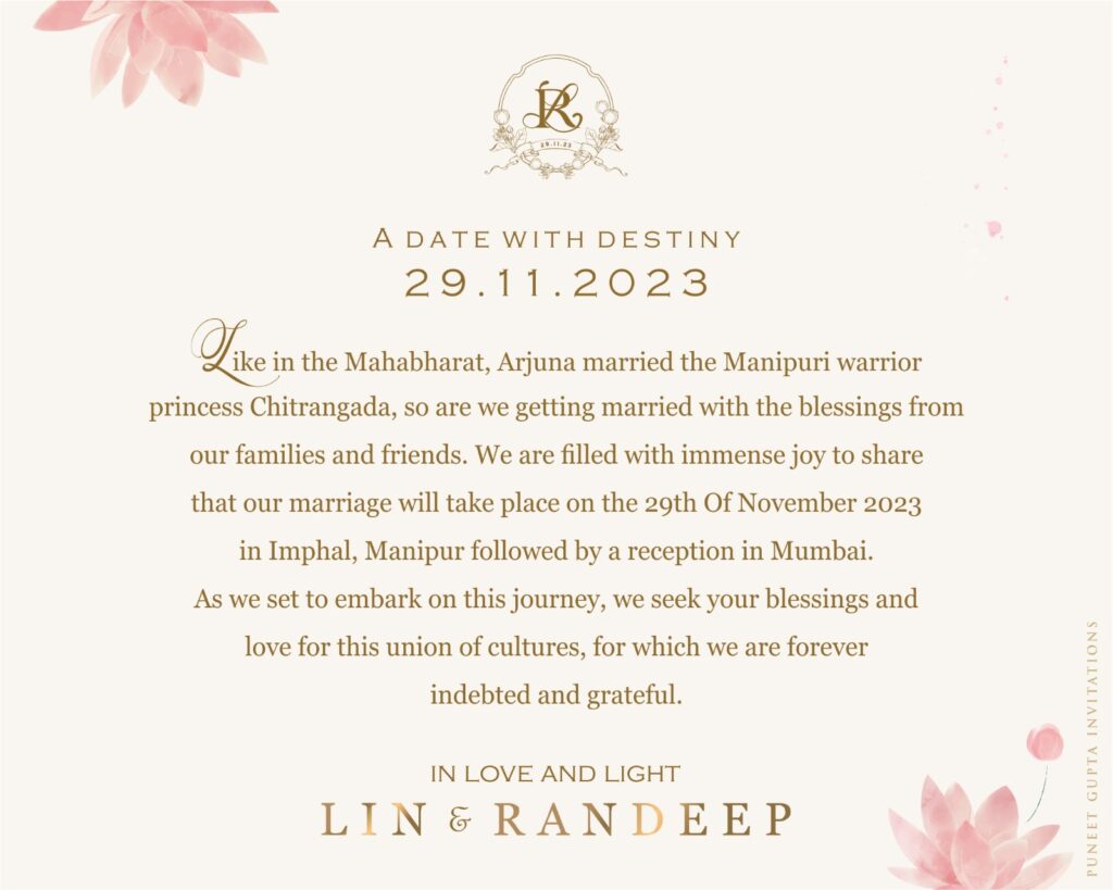 A Sneak Peek into Their Star-Studded Journey: Before we unravel the enchanting details of the wedding invite, let’s take a quick rewind through the reels of their cinematic journey. Randeep Hooda, the dashing heartthrob, and Lin Laishram, the epitome of grace, have graced the silver screen with their impeccable talent. Randeep’s intense performances in films like ‘Highway’ and ‘Sarbjit’ have left us in awe, while Lin’s notable work in ‘Rangoon’ and ‘Mary Kom’ has established her as a powerhouse performer.